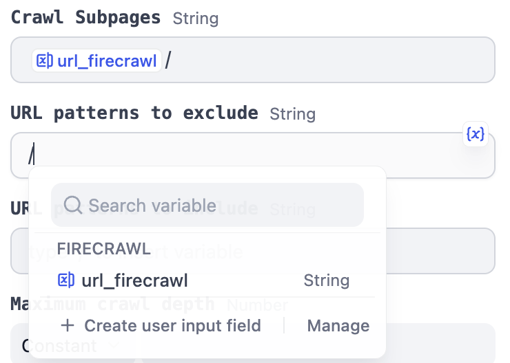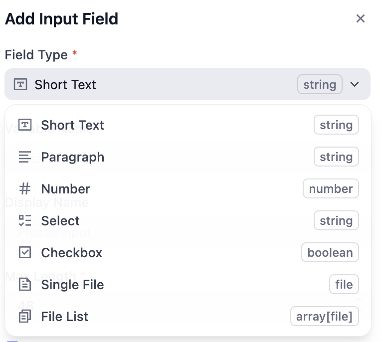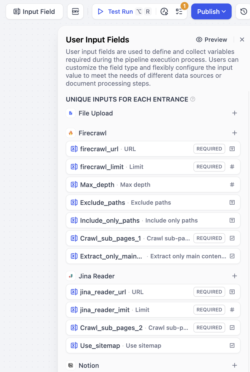 ナレッジパイプラインは7種類の入力変数をサポートします:
