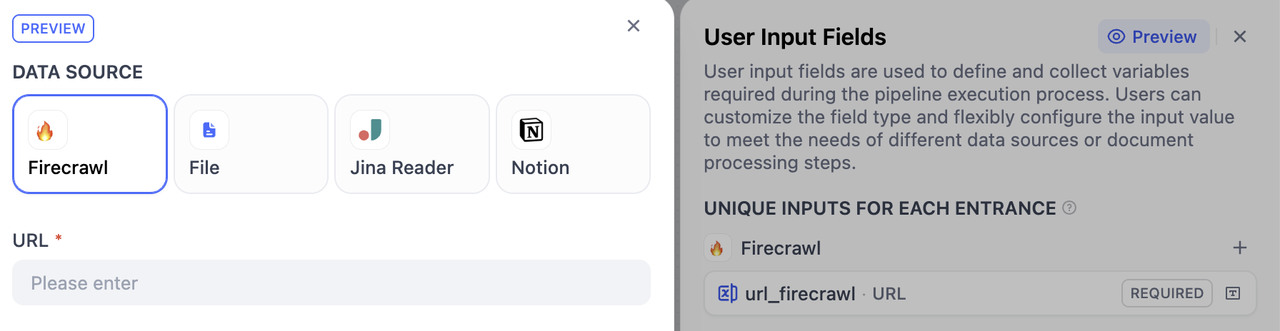 ユーザー入力フォームは、パイプラインを効果的に実行するために必要な初期情報を収集するために不可欠です。ワークフローのユーザー入力ノードと同様に、このフォームはユーザーから必要な詳細情報(アップロードするファイル、ドキュメント処理の特定パラメータなど)を収集し、パイプラインが正確な結果を提供するために必要なすべての情報を確保します。 これにより、さまざまなユースケースシナリオに特化した入力フォームを作成でき、さまざまなデータソースやドキュメント処理ステップに対するパイプラインの柔軟性と使いやすさを向上できます。フォームの作成方法