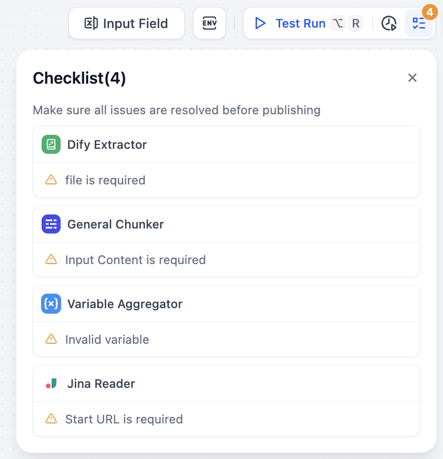 テスト前に、設定の不備によるテスト失敗を避けるため、設定の完全性をチェックすることをお勧めします。 右上のチェックリストボタンをクリックすると、システムが不足している部分を表示します。