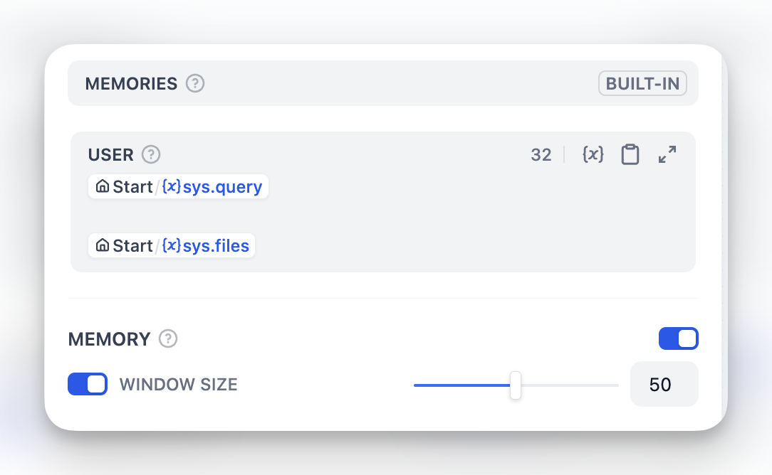 USERテンプレートを編集することで、ユーザープロンプトに入力される内容をカスタマイズできます。メモリはノード固有であり、異なる会話間では持続しません。